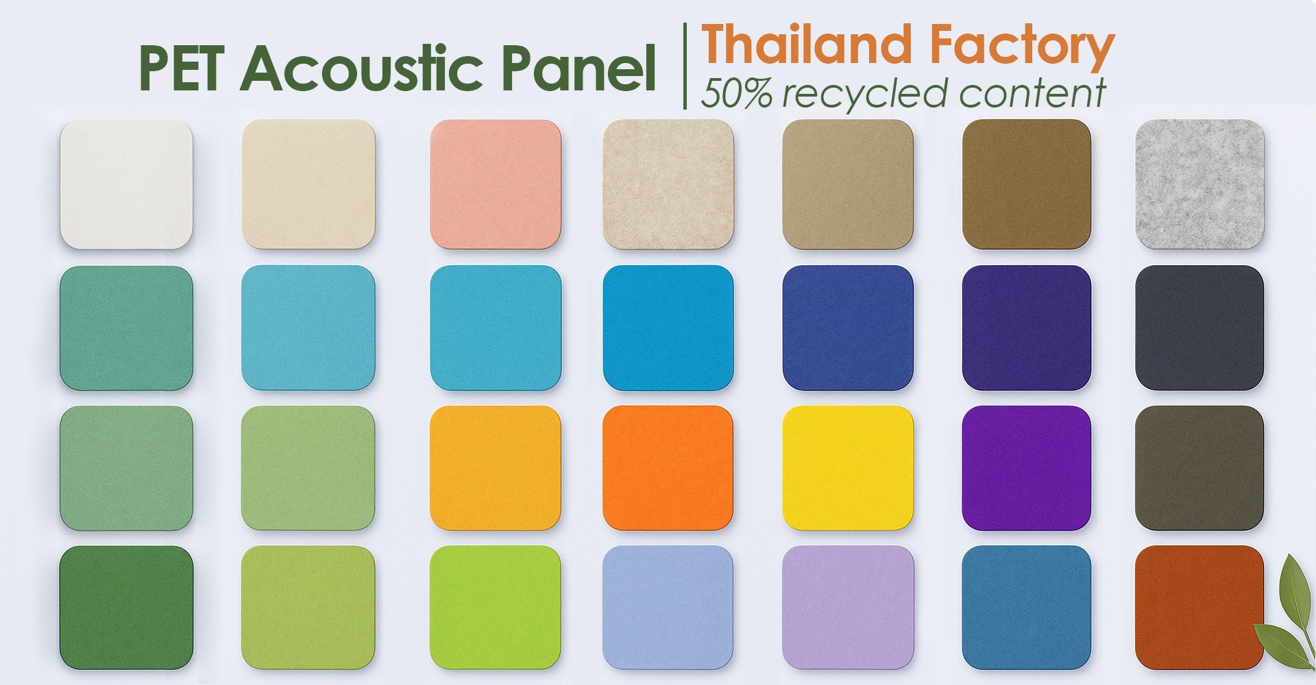 ![Regular Inventory for PET acoustic panels]()  Regular Inventory for PET acoustic panelsFeltCombo has regular inventory for PET acoustic panels. 9mm x 1220mm x 2440mm (0.35" x 48" x 96"), 39 colors in stock, flame retardant. 12mm x 1225mm x 2850mm (0.47"x 48.2" x 112.2"), 59 colors in stock, flame retardant.